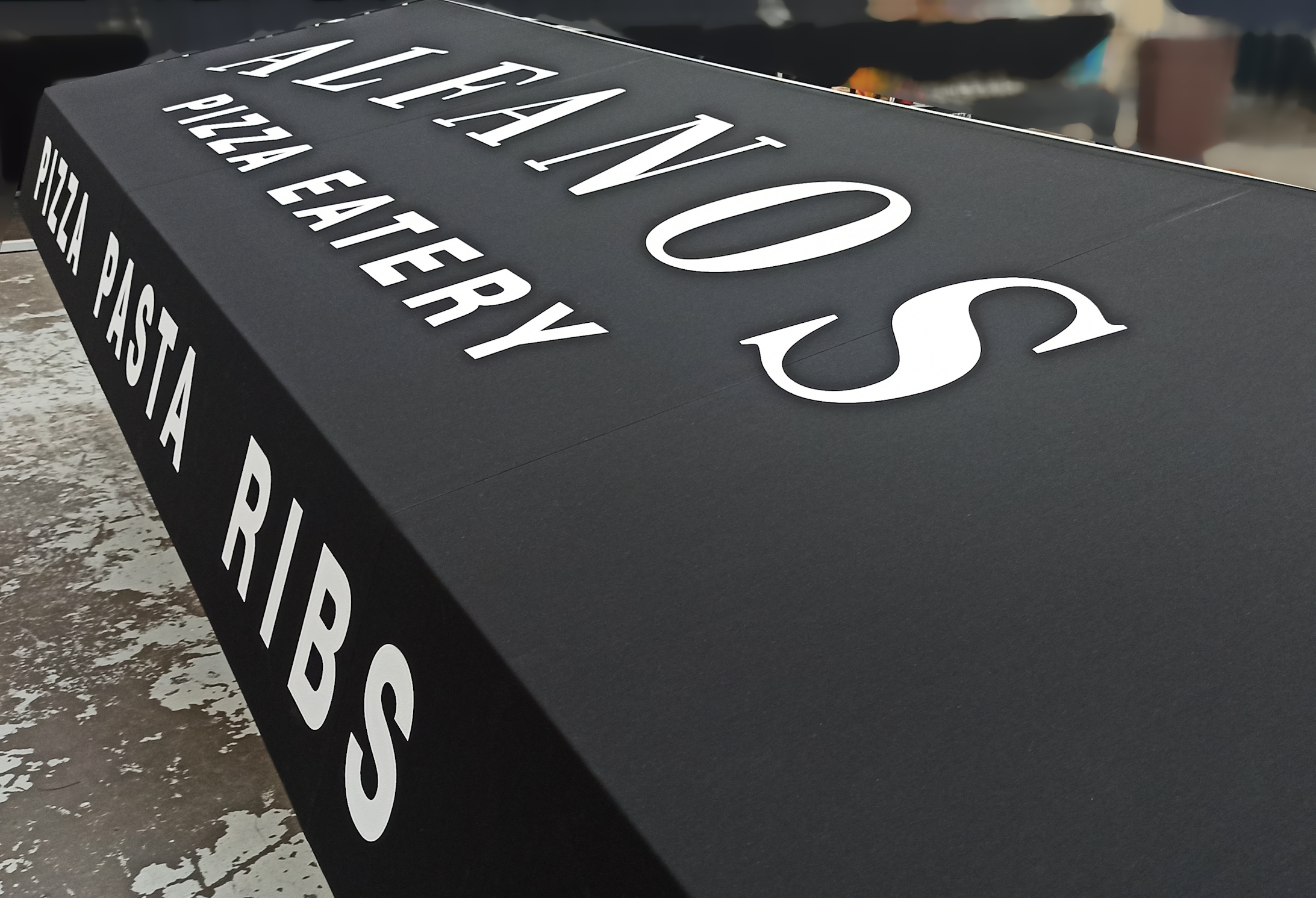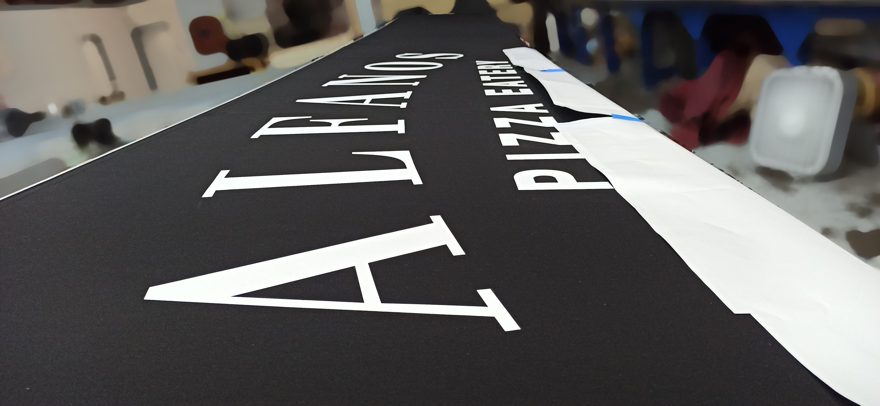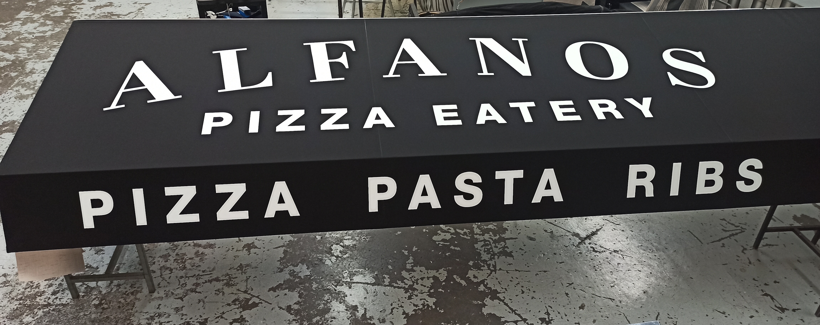 ALFANOS PIZZA EATERY — black awning, painted lettering (IL, 2023; prev. employer)